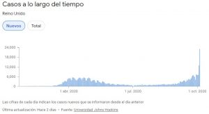 Los casos de coronavirus han aumentado progresivamente en Reino Unido desde principios de septiembre. Actualmente se ubican en la posición 12° de los países con más contagios, con 7.571 casos por 1 millón de personas.