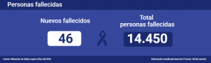 Con respecto a los decesos por causas relacionadas al Covid-19, se informó que son 46 los nuevos fallecidos, por lo que se llegó a un total de 14.450 en el país. Sobre la hospitalización, 733 pacientes se encuentran en la Unidad de Cuidados Intensivos (UCI), de estos, 90 se encuentran en estado crítico y 579 están conectados a ventilación mecánica invasiva.