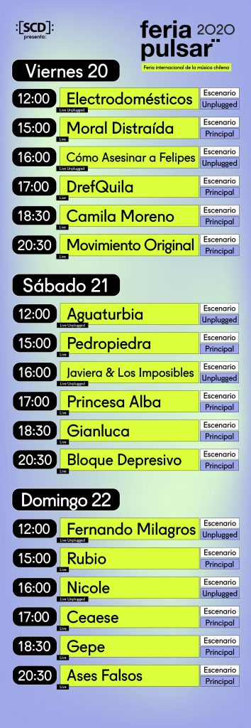 Cada show tendrá una cuidada dirección televisiva y un streaming de alta calidad, mediante la cual podrás ver las presentaciones de Camila Moreno, Drefquila, Moral Distraída, Movimiento Original, Pedropiedra, Princesa Alba, Gianluca, Bloque Depresivo, Ceaese, Gepe, Rubio, Ases Falsos, Electrodomésticos, Cómo Asesinar a Felipes, Aguaturbia, Javiera & Los Imposibles, Fernando Milagros y Nicole.