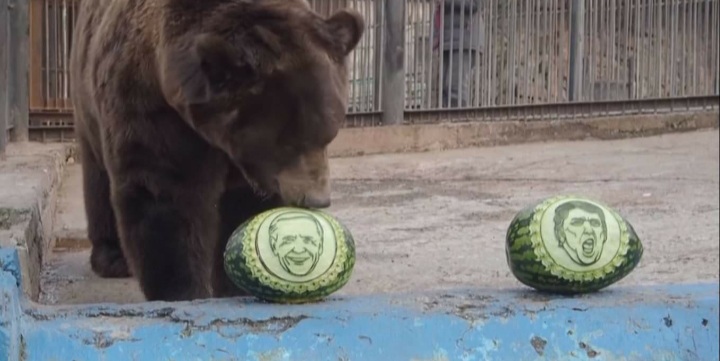 Khan, un tigre de bengala blanco, fue el primero en acercarse. El bello animal ignoró por completo el melón tallado con el rostro de Trump y se puso a juguetear con el de Biden. El otro tigre, Bartek, votó igual que su compañero al escoger el melón del demócrata luego de debatirse un rato. Finalmente, Buyan, el oso, se acercó a la misma opción, rompiendo y comiéndose el melón.