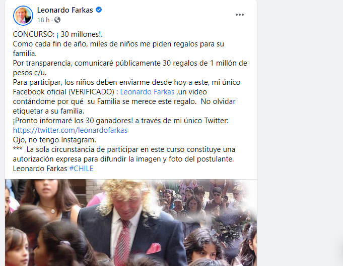 “Como cada fin de año, miles de niños me piden regalos para su familia. Por transparencia, comunicare públicamente 30 regalos de 1 millón de pesos c/u.”, anunció el multimillonario Leonardo Farkas en su cuenta de Facebook. Se trata de un concurso impulsado por el empresario para celebrar las fiestas de fin de año.