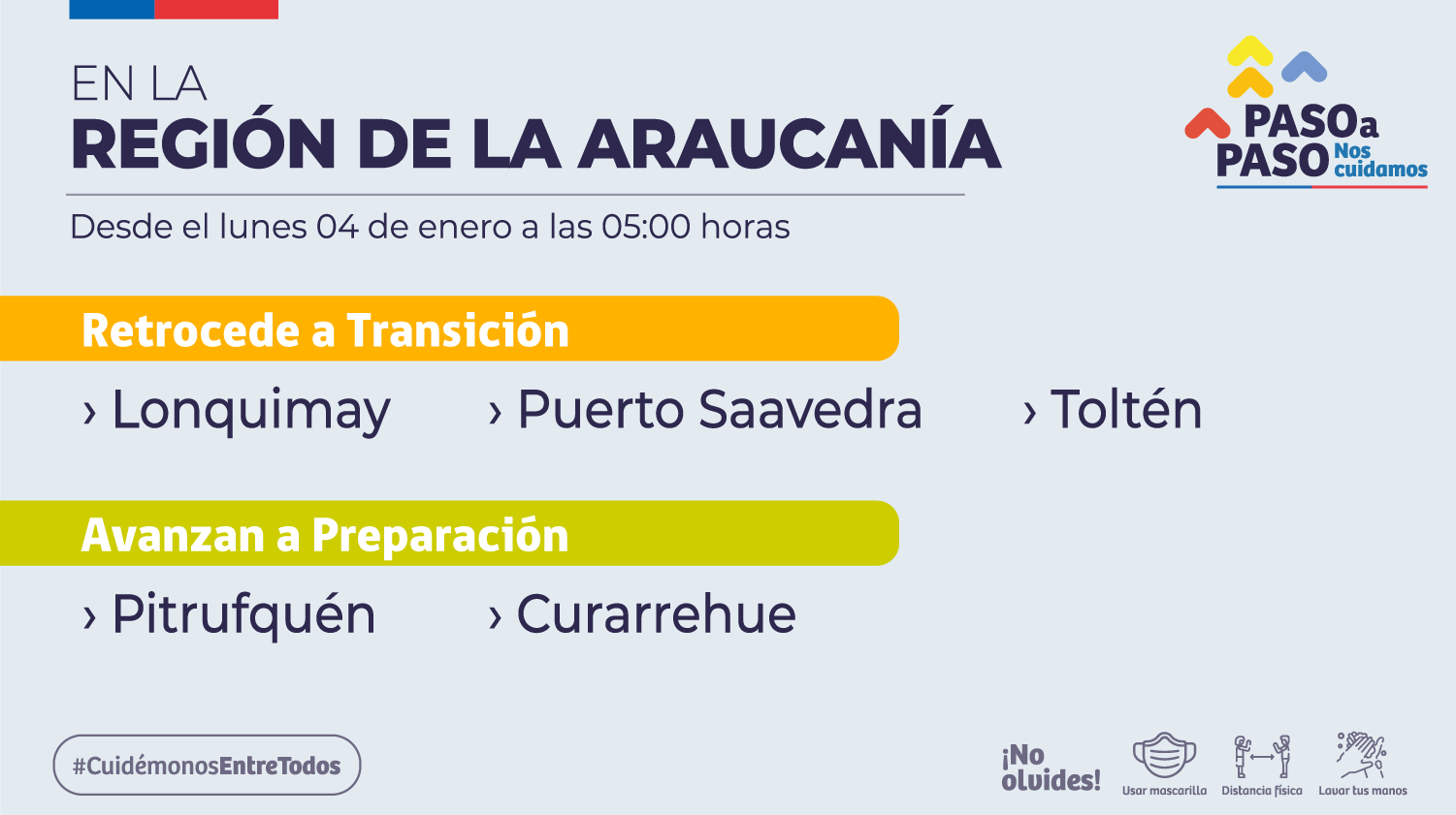 Respecto a las actualizaciones del Plan Paso a Paso en la Región de La Araucanía, se informaron múltiples cambios. Las comunas de Pitrufquén y Curarrehue avanzarán a Preparación, mientras que Lonquimay, Puerto Saavedra y Toltén retroceden a la Fase de Transición.