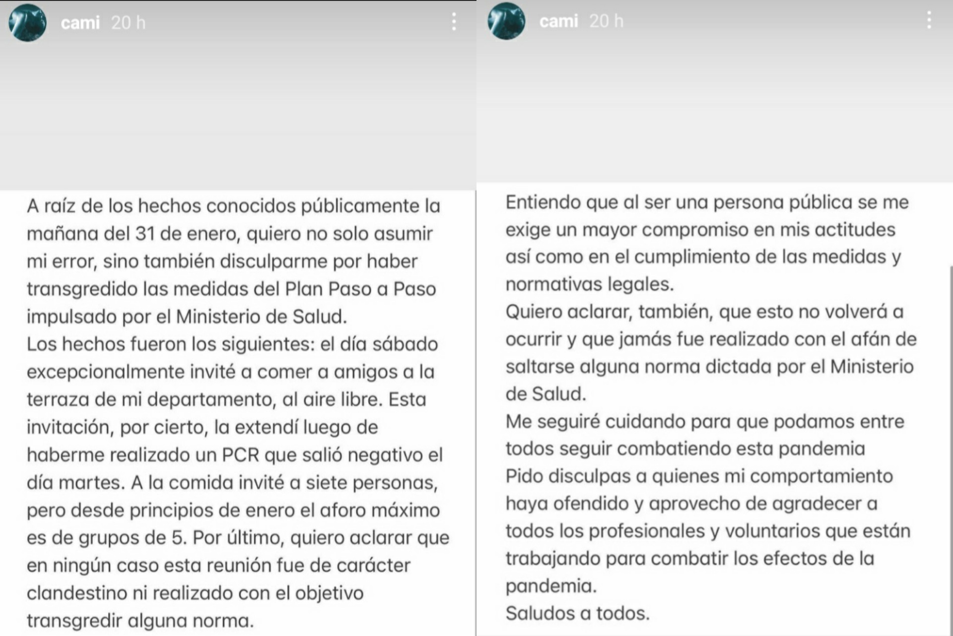 Además, aseguró que no se trató de una "fiesta clandestina", como se le estaba acusando. Sin embargo, oficiales de Carabineros llegaron al lugar luego de la queja de vecinos por ruidos molestos en el lugar. "Quiero aclarar que en ningún caso esta reunión fue de carácter clandestina", señaló.
