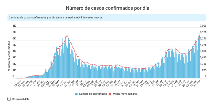 El domingo 21 de marzo, las autoridades confirmaron 6.836 nuevos casos de Covid-19.