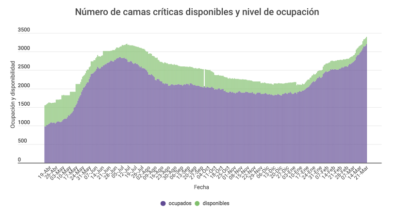 Gráfico camas críticas disponibles (verde) y nivel de ocupación (morado)