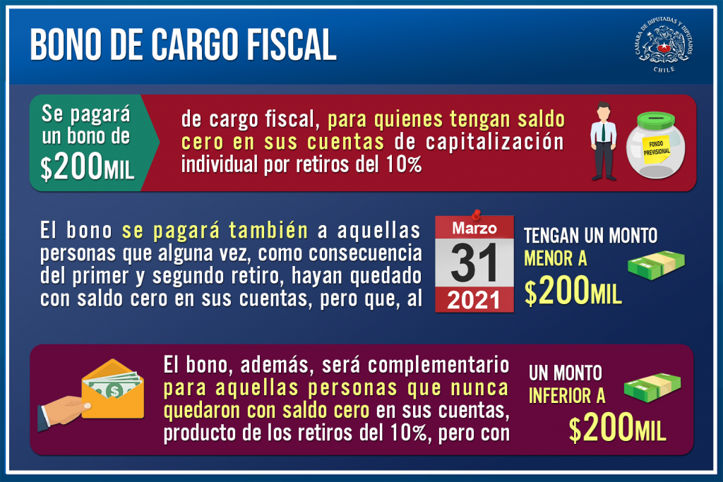 La Cámara de Diputados aprobó el proyecto que establece un nuevo bono de cargo fiscal para quienes tengan saldo cero en sus cuentas de AFP por los retiros del 10% de los fondos previsionales. Se estima que el bono beneficiará a 3.600.000 personas.