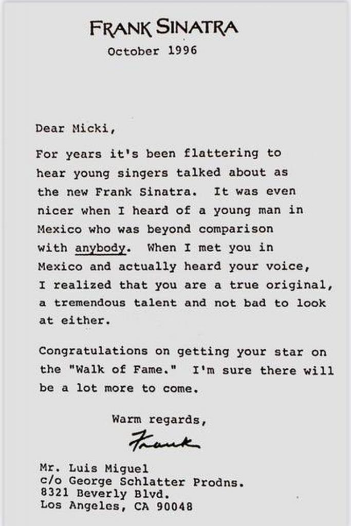 “Querido Micki: Durante años ha sido halagador escuchar a jóvenes cantantes hablar sobre el nuevo Frank Sinatra. Fue aún mejor cuando escuché de un joven en México que no tenía comparación con nadie”, es el potente inicio de la carta del interprete de "My Way".