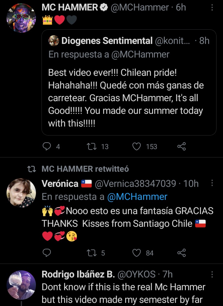 Rápidamente los fanáticos chilenos de MC Hammer corrieron a su cuenta para verificar que sí se trataba de él. Así, comenzaron múltiples interacciones con el rapero, quien continuó publicando los saludos que sus seguidores nacionales le escribían.