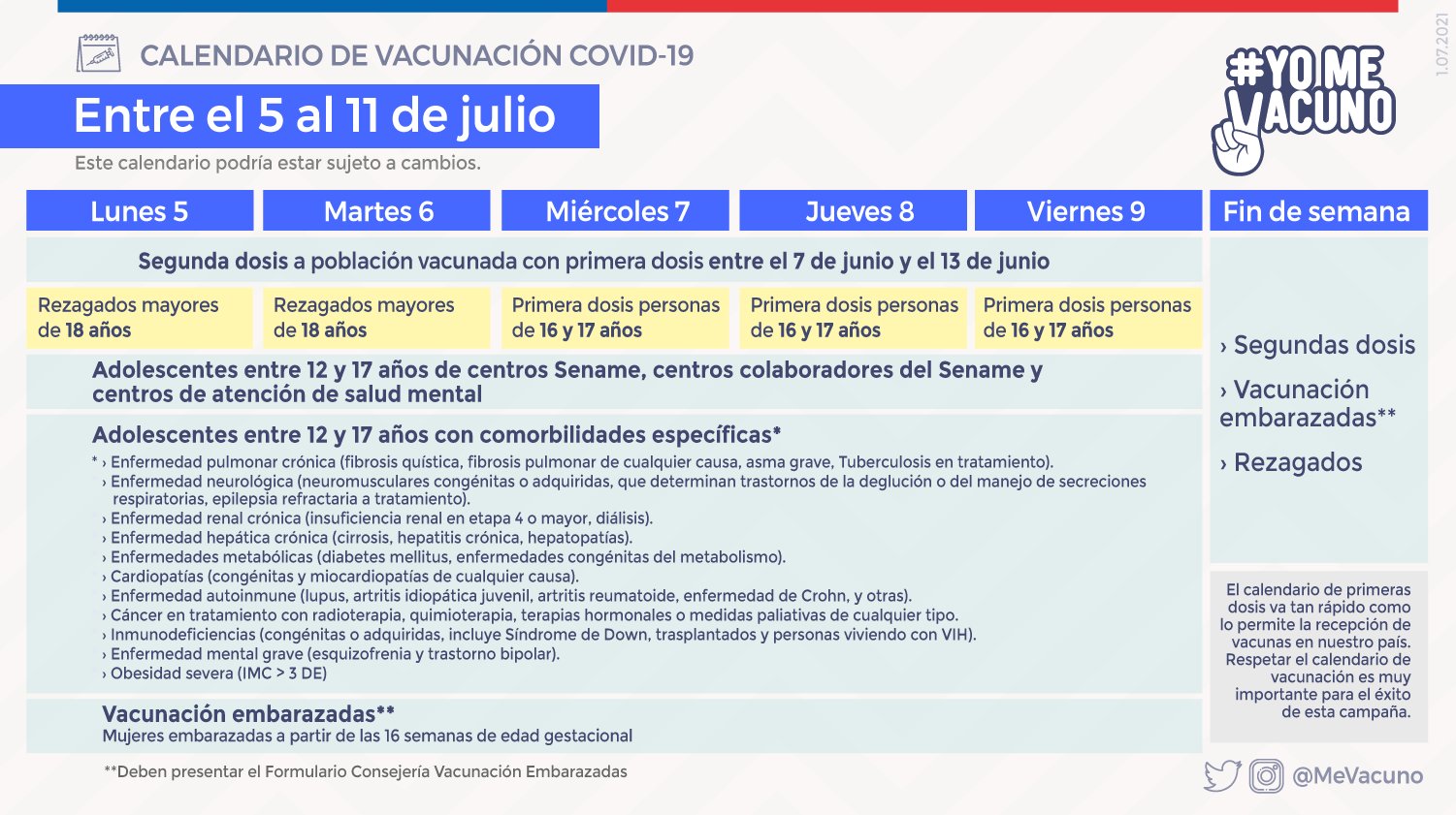 En tanto para el resto de la semana, seguirán dando las primeras dosis para jóvenes entre 16 y 17 años. Asimismo, las personas entre 12 y 17 años de centros de Sename, colaboradores y centros de salud mental podrán vacunarse durante la semana, de igual forma los adolescentes de la misma edad con comorbilidades específicas podrán vacunarse también.