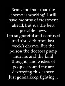 "Los escaneos indican que la quimo está funcionando!, todavía tengo meses de tratamiento pendientes, pero esto es la mejor noticia posible. Estoy muy agradecido y confundido y también harto de la última semana de quimo" fue el mensaje del bajista y vocalista de Blink 182.