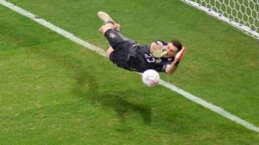 Se trata de un penal que Martínez atajó en el encuentra de la semifinal contra Colombia. Según los fanáticos, Diego Maradona habría tenido una "aparición especial" en el partido, particularmente en este momento exacto. Sin embargo, no sería su silueta, sino que sus iniciales.