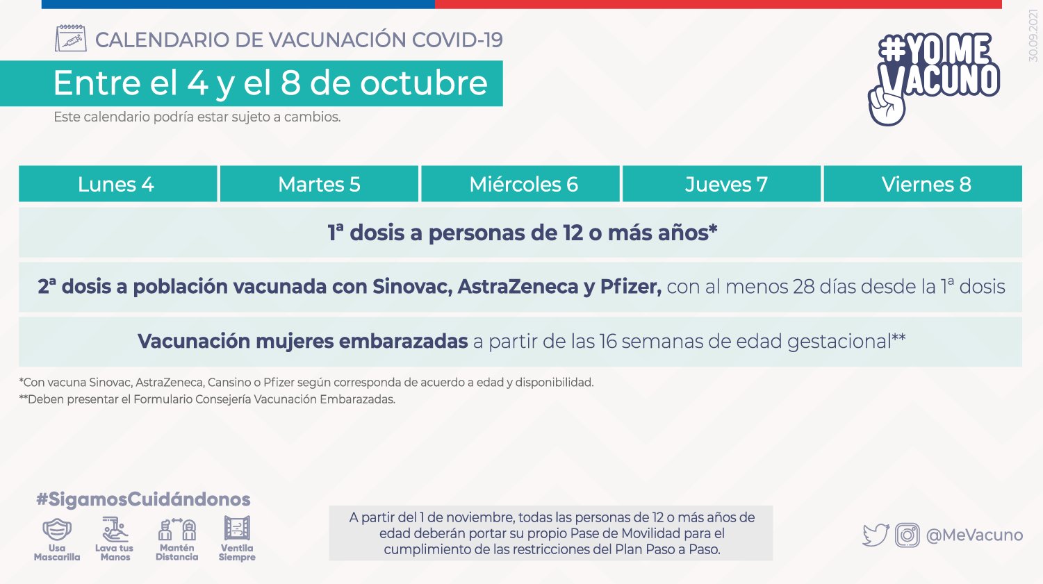 A través de su sitio oficial, el Minsal informó quiénes recibirán la vacuna comenzando desde el 4 de octubre. Cabe recordar que el Calendario de Vacunación actual se centra principalmente en los más jóvenes y en entregar la dosis de refuerzo.