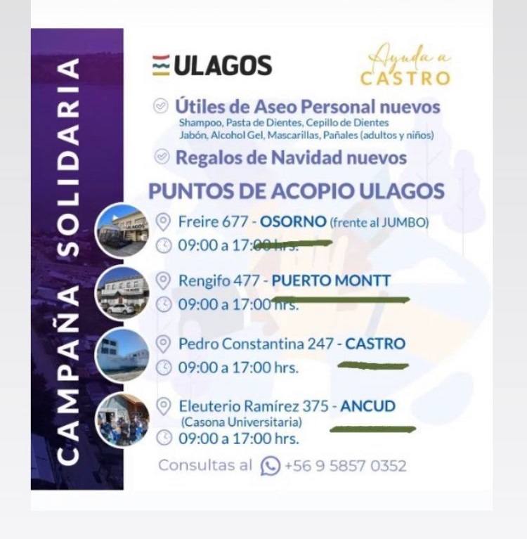 Por otro lado, la Universidad de Los Lagos dio a conocer distintos puntos de acopio en las comunas de Osorno, Puerto Montt, Castro y Ancud. Para donar útiles de aseo personal nuevos y regalos de navidad nuevos.