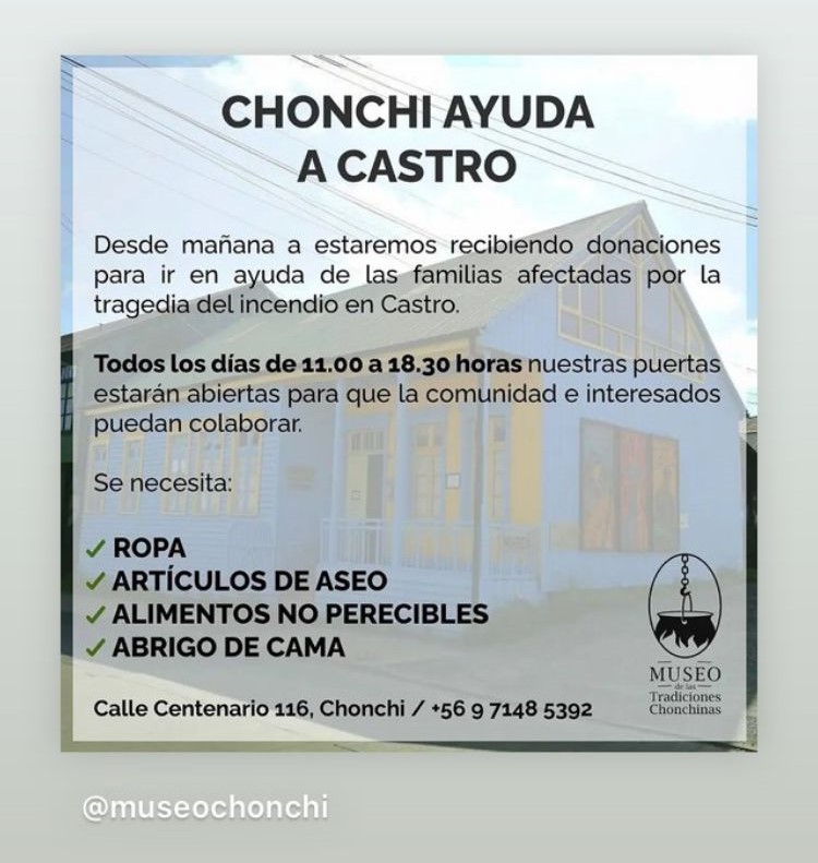 La cuenta de Instagram del Museo de las Tradiciones Chonchinas dio a conocer una cuenta bancaria titular del Colegio de Profesores de Castro para ir en ayuda de las familias afectadas. Esto, asegurando la comunicación y transparencia de todo el proceso.