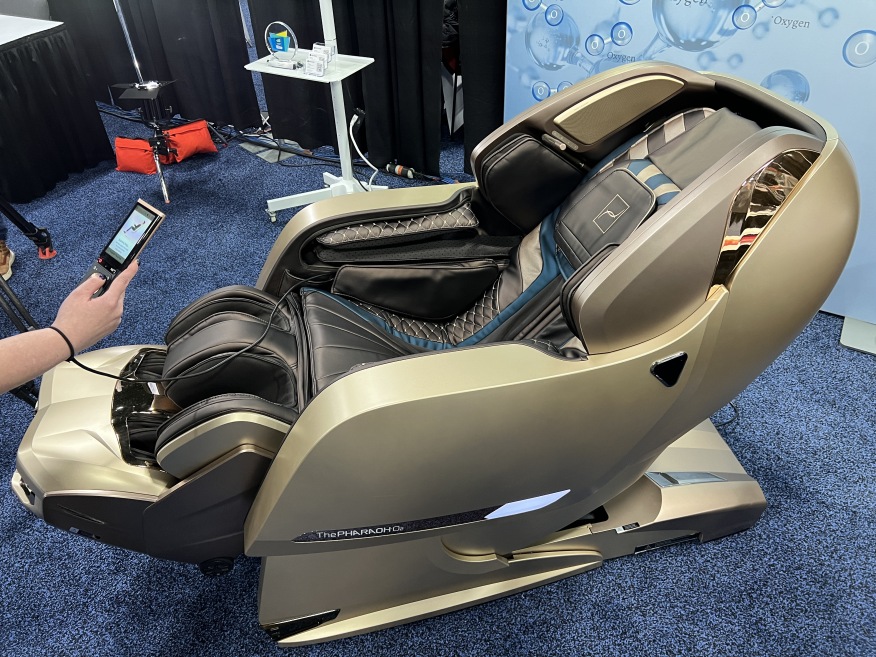 Una silla de masaje Pharaoh O2 de Bodyfriend con altavoces premium, control por voz y una ráfaga de oxígeno.