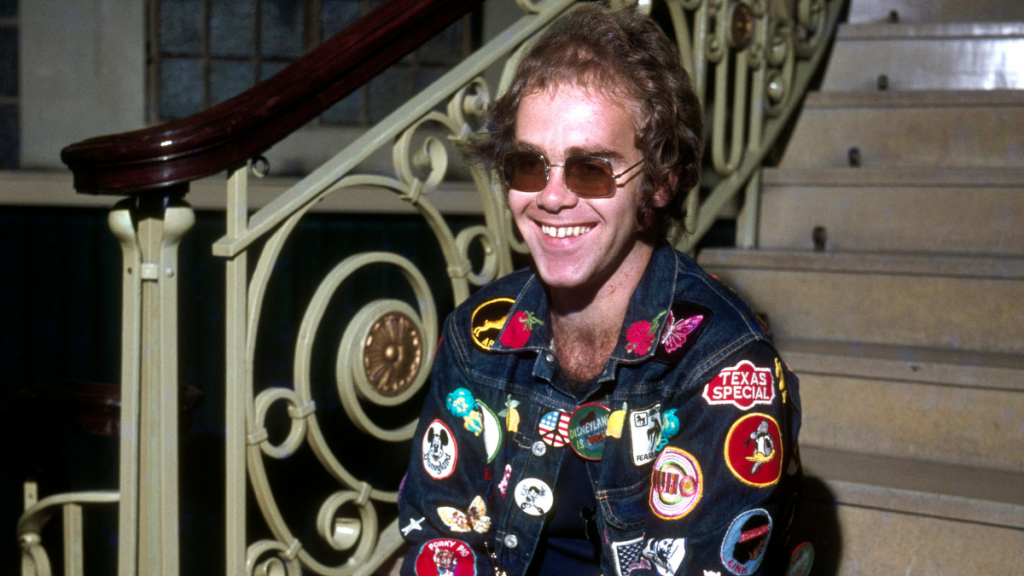 En la imagen se ve a Elton John usando una chaqueta de mezclilla llena de parches, que el sacaba de todos los lugares a los que iba. Intentó ir a Disneylandia con eso, pero no lo dejaron por la cantidad de parches que portaba.