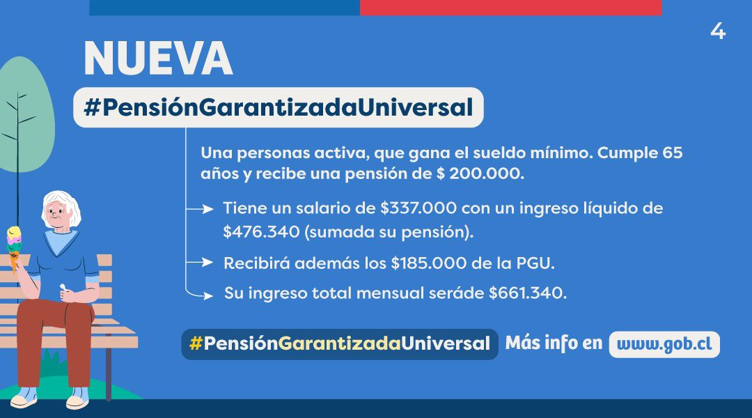 A esta base, se sumará la Pensión Garantizada Universal de $185 mil pesos, contemplando un ingreso mensual de $661 mil pesos. Cabe recordar que esto dependerá del monto base de cada persona. Además, se sumará a su pensión autofinanciada.