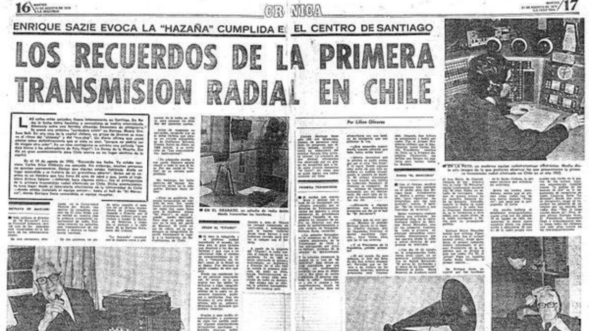La primera transmisión radial en Chile se remonta al 19 de agosto de 1922 y fue posible gracias a la iniciativa de los profesores Enrique Sazié y Arturo Salazar, ambos ingenieros de la Universidad de Chile. Se realizó desde un transmisor montado en el Laboratorio de Electrónica de la Casa Central de su misma universidad, hasta un receptor instalado en el pasillo del Diario El Mercurio.