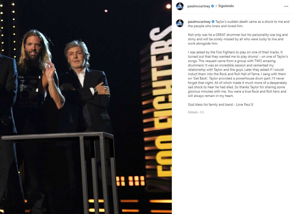 Ahora Paul McCartney se unió a la larga lista de artistas que se han despedido de Taylor Hawkins. A través de una serie de tweets, el músico lamentó su fallecimiento, homenajeó su persona y recordó una emotiva historia con el baterista.