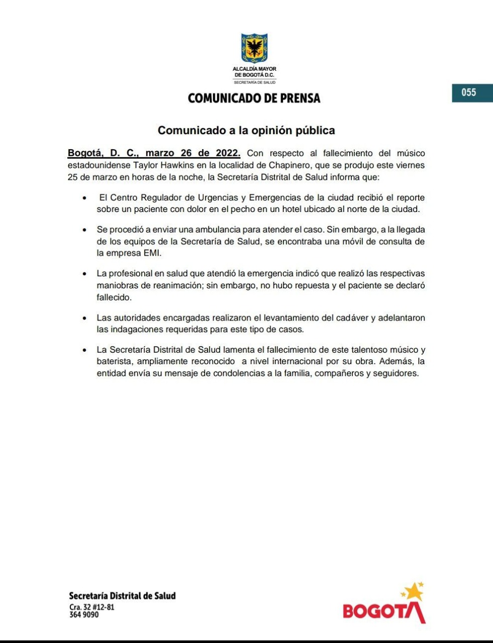 La noche del viernes la banda Foo Fighters confirmó la muerte de Taylor Hawkins, su baterista, en Colombia. Aunque todavía la causa de muerte está siendo investigada, las autoridades de salud de Bogotá dieron a conocer algunos detalles sobre lo ocurrido.