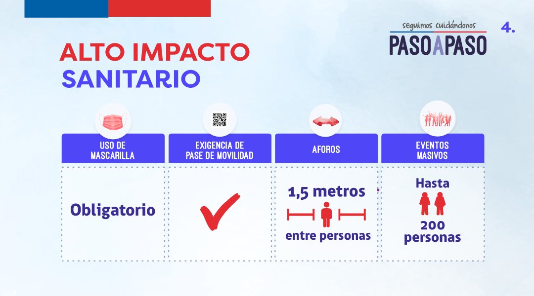 La primera de esta se referiría a los casos más complejos, en comunas y regiones donde existe una alta circulación viral del coronavirus. Por esto, continuará siendo obligatorio el uso de mascarillas en espacios abiertos y cerrados, además de exigir el Pase de Movilidad.