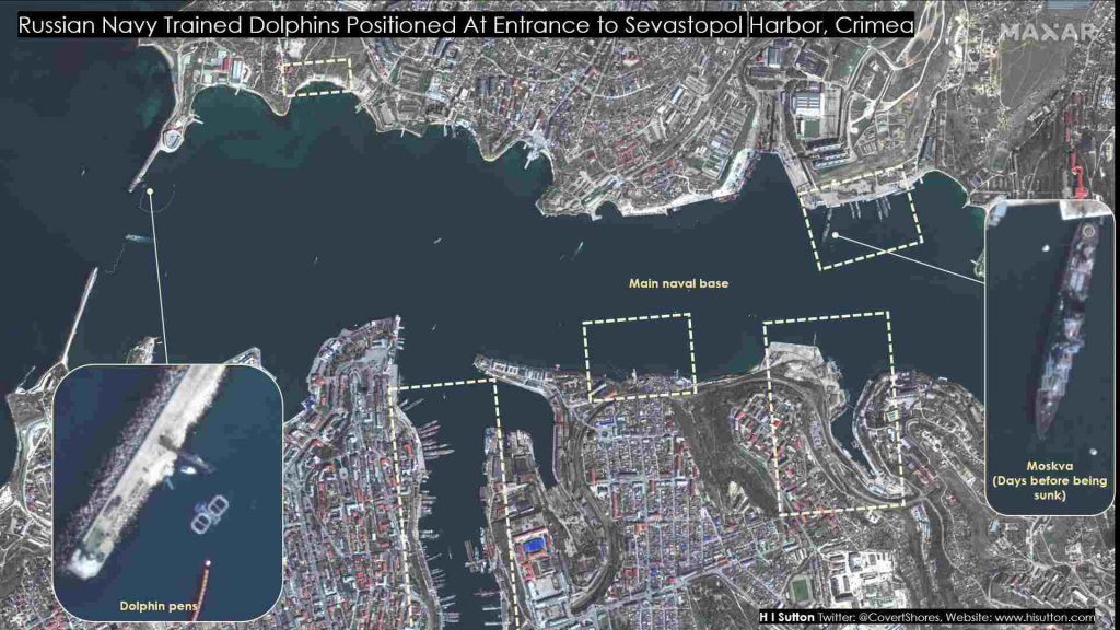 El Instituto Naval de Estados Unidos (USNI) analizó imágenes de satélite que captó la compañía estadounidense, Maxar Technologies. Con las que demostraron que en Rusia se desplegaron dos corrales con delfines militarpara proteger una base naval del Mar Negro, de Sebastopol (Crimea), durante su invasión a Ucrania.