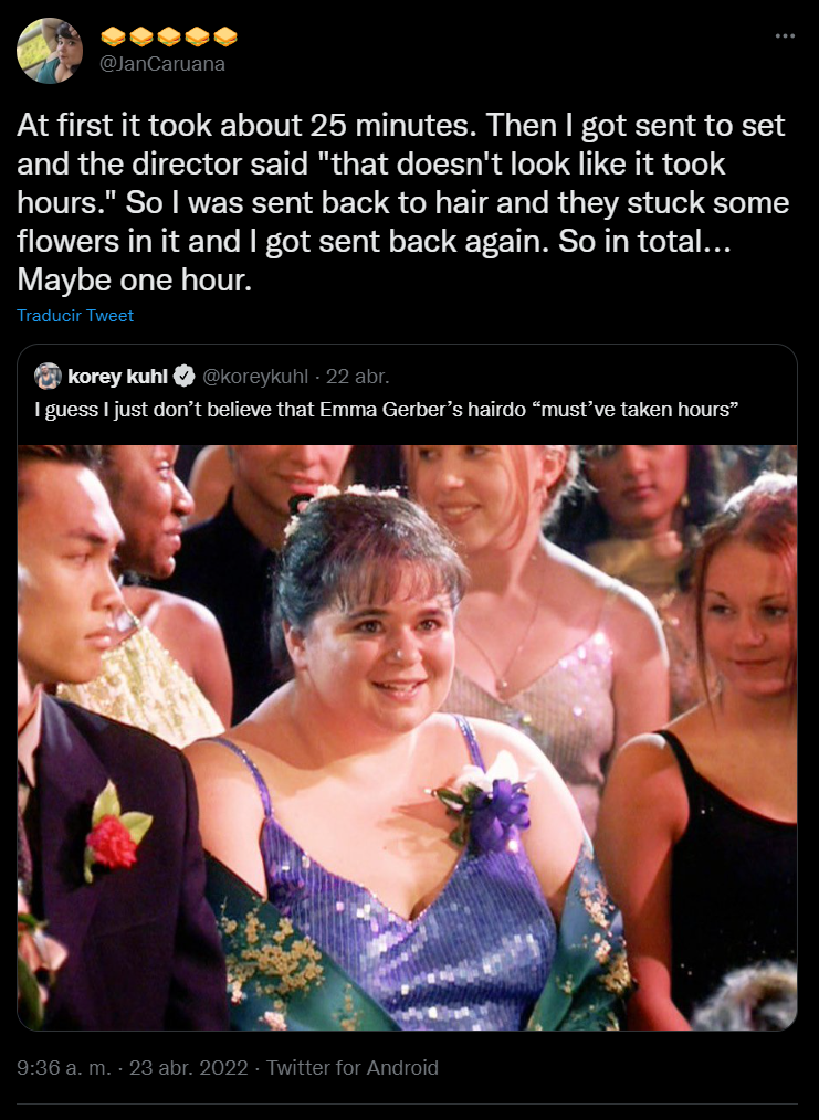 Ahora, a 18 años desde el estreno de la película, Jan Caruana respondió a un tuit de la ex concursante del programa The Amazing Race, Korey Kuhl. Quien publicó una foto de Emma Gerber en el baile y dijo lo siguiente. "Supongo que simplemente no creo que el peinado de Emma Gerber 'debe haber tomado horas'".