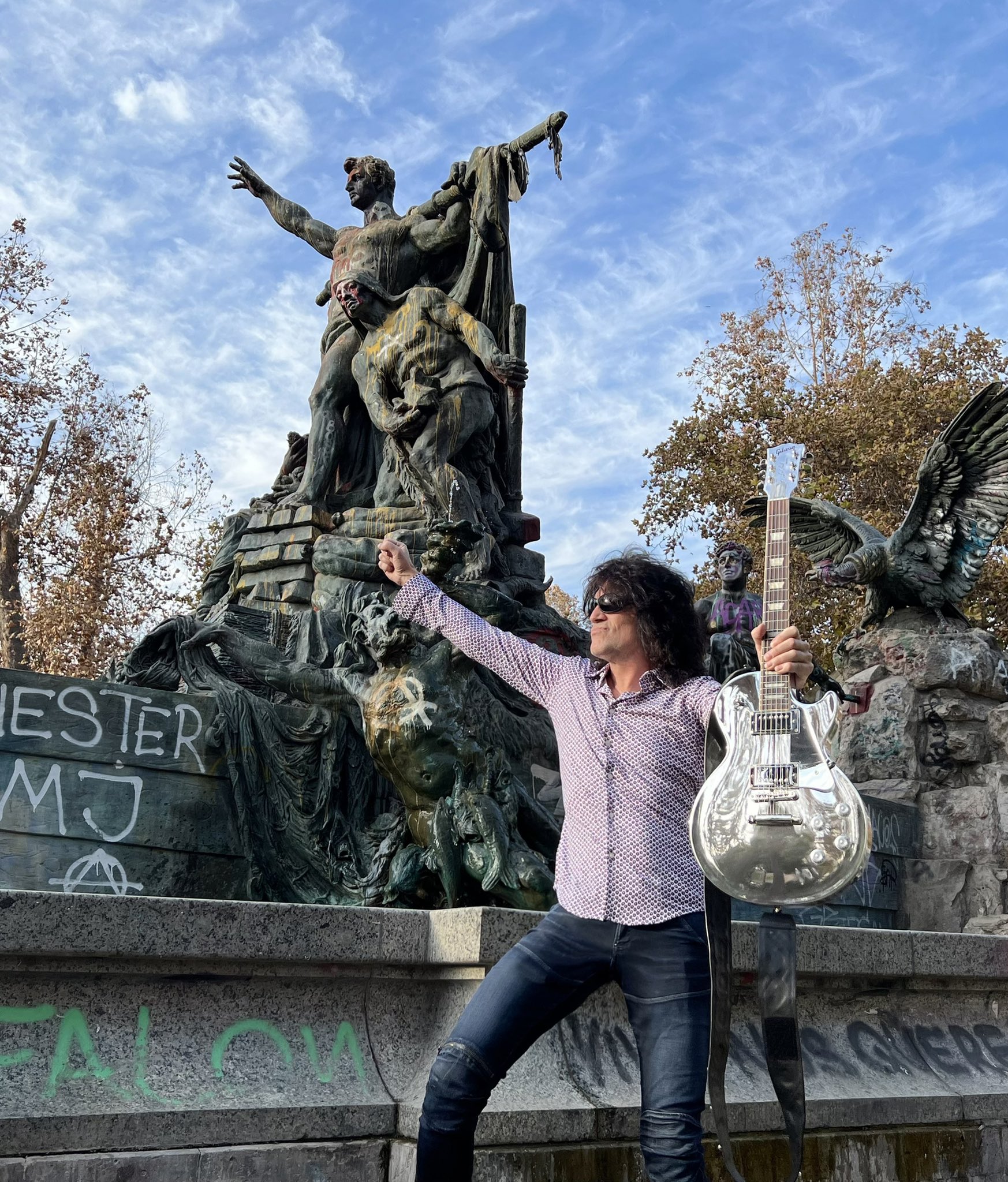 Acompañado de su preciado instrumento, el guitarrista de Kiss recorrió puntos del centro de Santiago, posando junto a algunos rayados y estatuas. Rápidamente las imágenes se hicieron virales, con algunos fanáticos intentando encontrarlo.