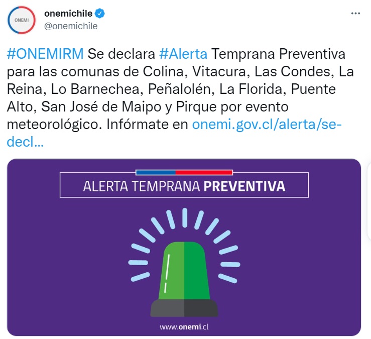 La alerta de la Onemi con respecto al pronóstico de lluvias en Santiago se decretó para las siguientes comunas. Colina, Vitacura, Las Condes, La Reina, Lo Barnechea, Peñalolén, La Florida, Puente Alto, San José de Maipo y Pirque.