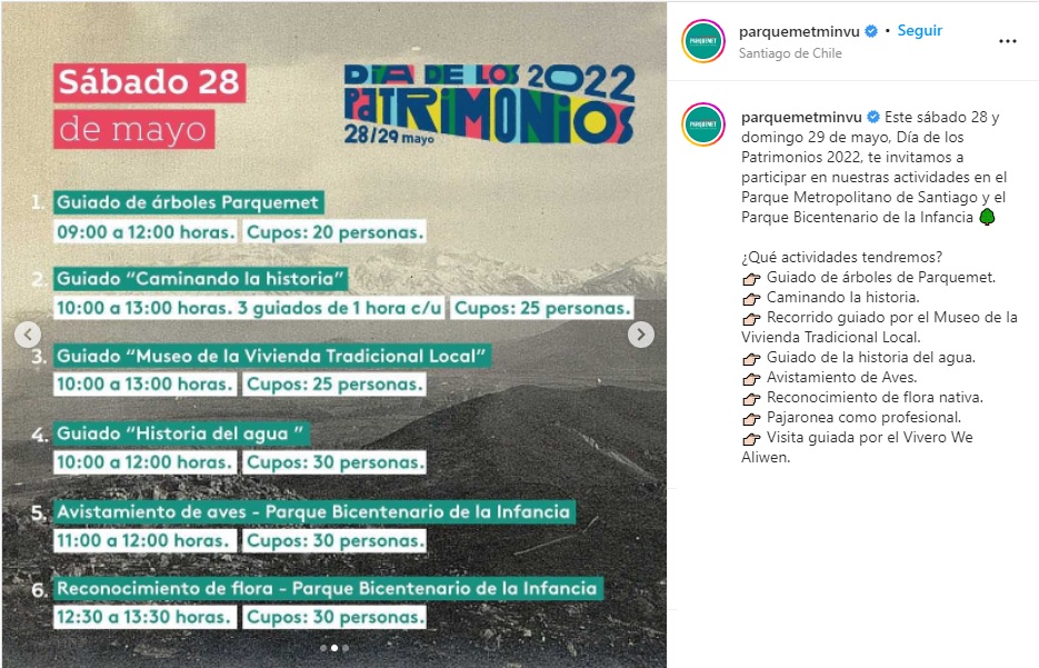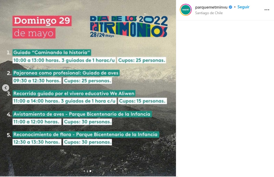 Si estás buscando algo al aire libre, puedes hacer una visita al Parque Metropolitano de Santiago. Para celebrar esta jornada, la Conaf anunció que el acceso a los Parques Nacionales será gratuito durante el fin de semana del Día del Patrimonio.
