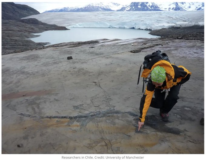 En 2009, la doctora y paleontóloga Judith Pardo-Pérez llegó al sur de Chile para una exploración en el glaciar de Tyndall. Pero no sería sino hasta el último día de esta campaña cuando se encontraría con el impresionante descubrimiento.