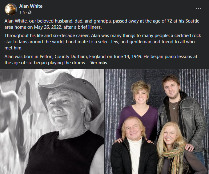 A través de un comunicado en la página de Facebook del baterista (vía Radio Futuro), su esposa dijo lo siguiente. "Alan White, nuestro amado esposo, padre y abuelo; falleció a la edad de 72 años en su casa en el área de Seattle el 26 de mayo de 2022, luego de una breve enfermedad".