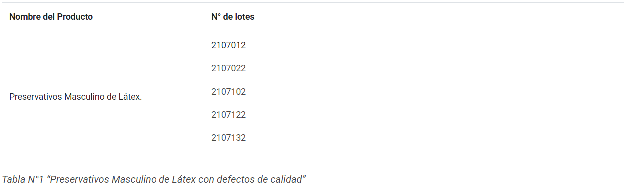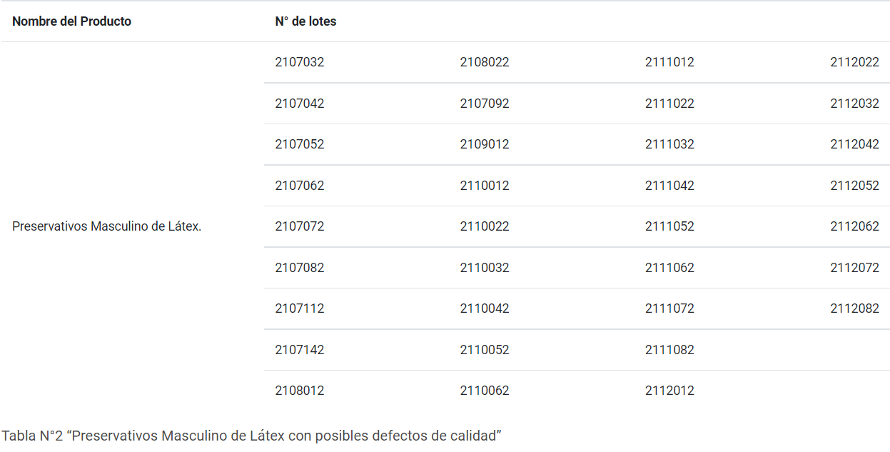 Como consecuencia, el organismo realizó un llamado a la ciudadanía a no utilizar los preservativos masculinos de látex de la marca Suzhou Colour-Way New Material Co, Ltd. de los lotes nombrados más abajo. Asimismo, se recomienda que sean devueltos al establecimiento de salud donde fueron recibidos o adquiridos.