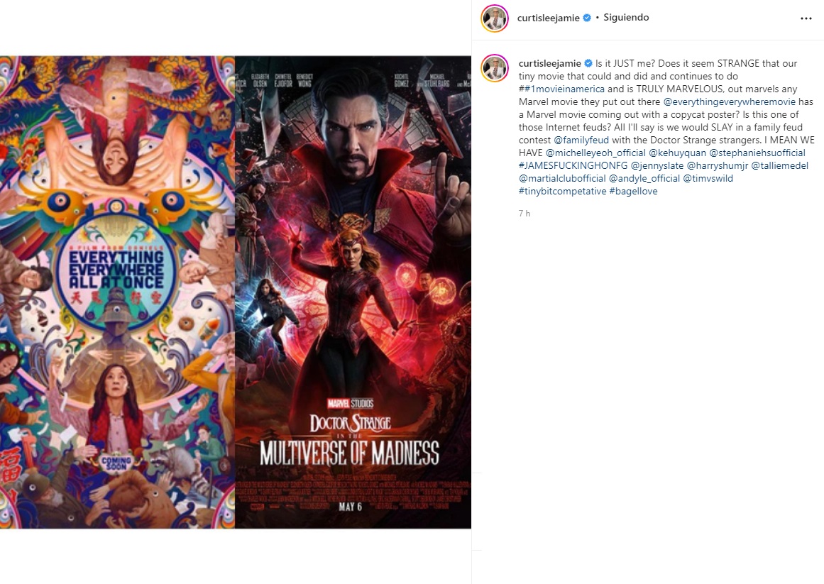 A través de su cuenta de Instagram, Jamie Lee Curtis subió un curioso post donde comparaba Doctor Strange con su nueva película, Everything Everywhere All At Once. Esto pues, según ella, los posters son demasiado similares como para ser coincidencia.