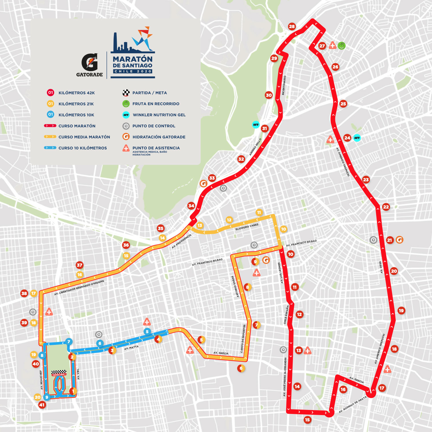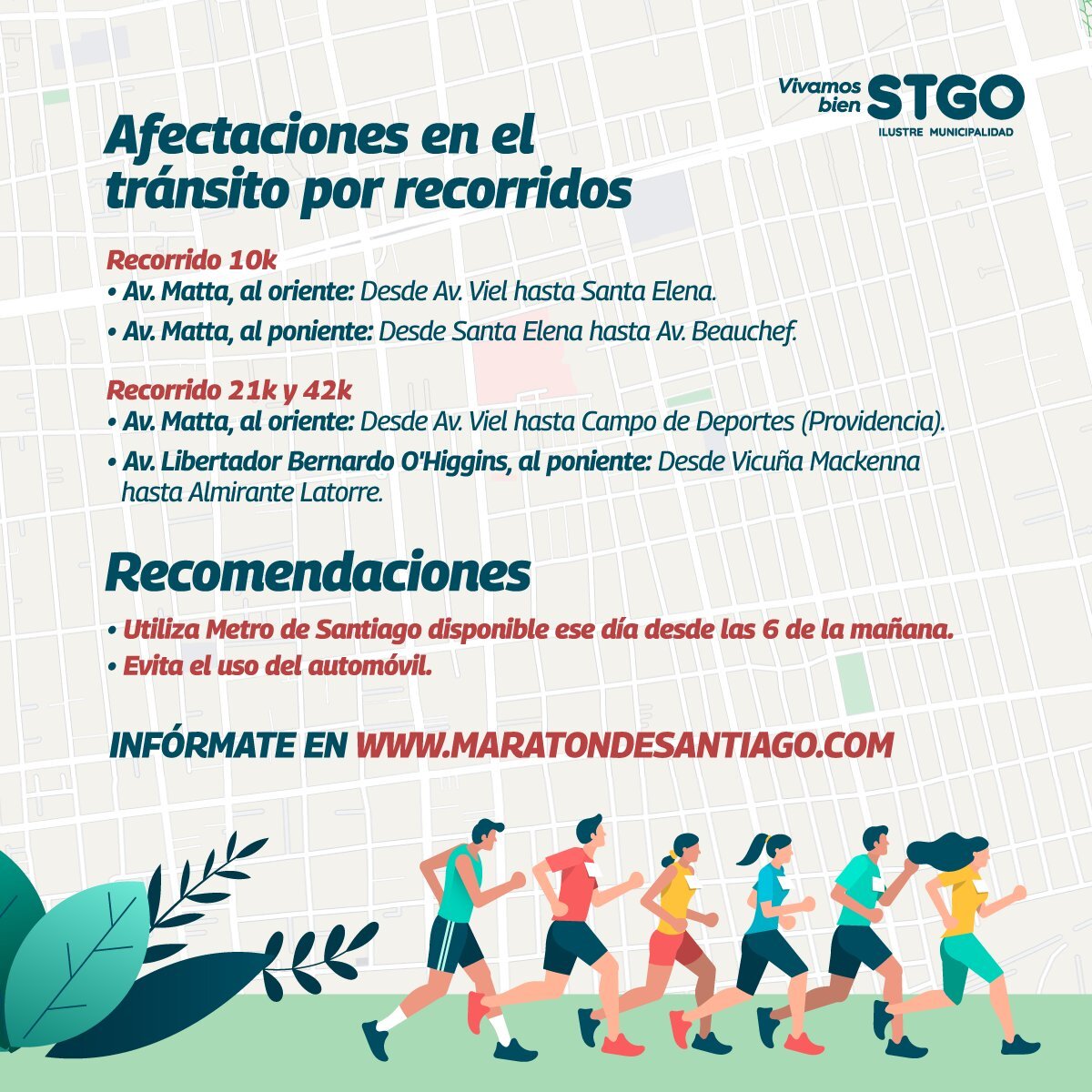 De esta forma, recomiendan evitar el perímetro de la maratón 7:00 horas del domingo 8 de mayo. Es decir, al interior del cuadrante: Alameda – Beauchef – Gral. Rodizzoni – Av. Viel – Av. Matta – Av. Grecia – Antonio Varas – Bilbao – Av. Macul – Av. Grecia- A. Vespucio – Parque Bicentenario -Av. Andrés Bello y Av. Providencia.
