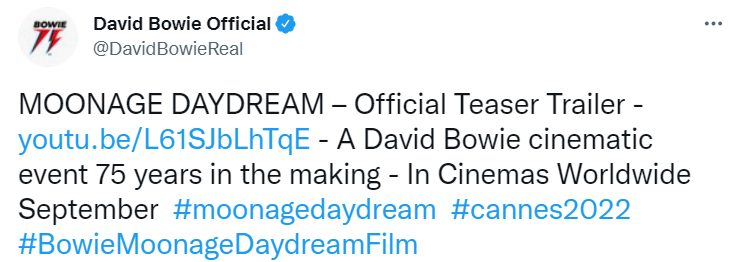 El documental sacó a la luz su primer tráiler en el marco de su exposición en el Festival de Cannes 2022. La cinta incluye imágenes de los archivos personales del artista. Entre ellos encontraremos clips inéditos de actuaciones de Bowie y 40 canciones remasterizadas.