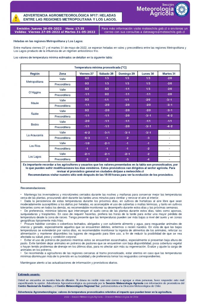 La Dirección Meteorológica de Chile emitió una advertencia agrometeorológica por heladas, las cuales se producirán en la zona central y del sur de Chile.