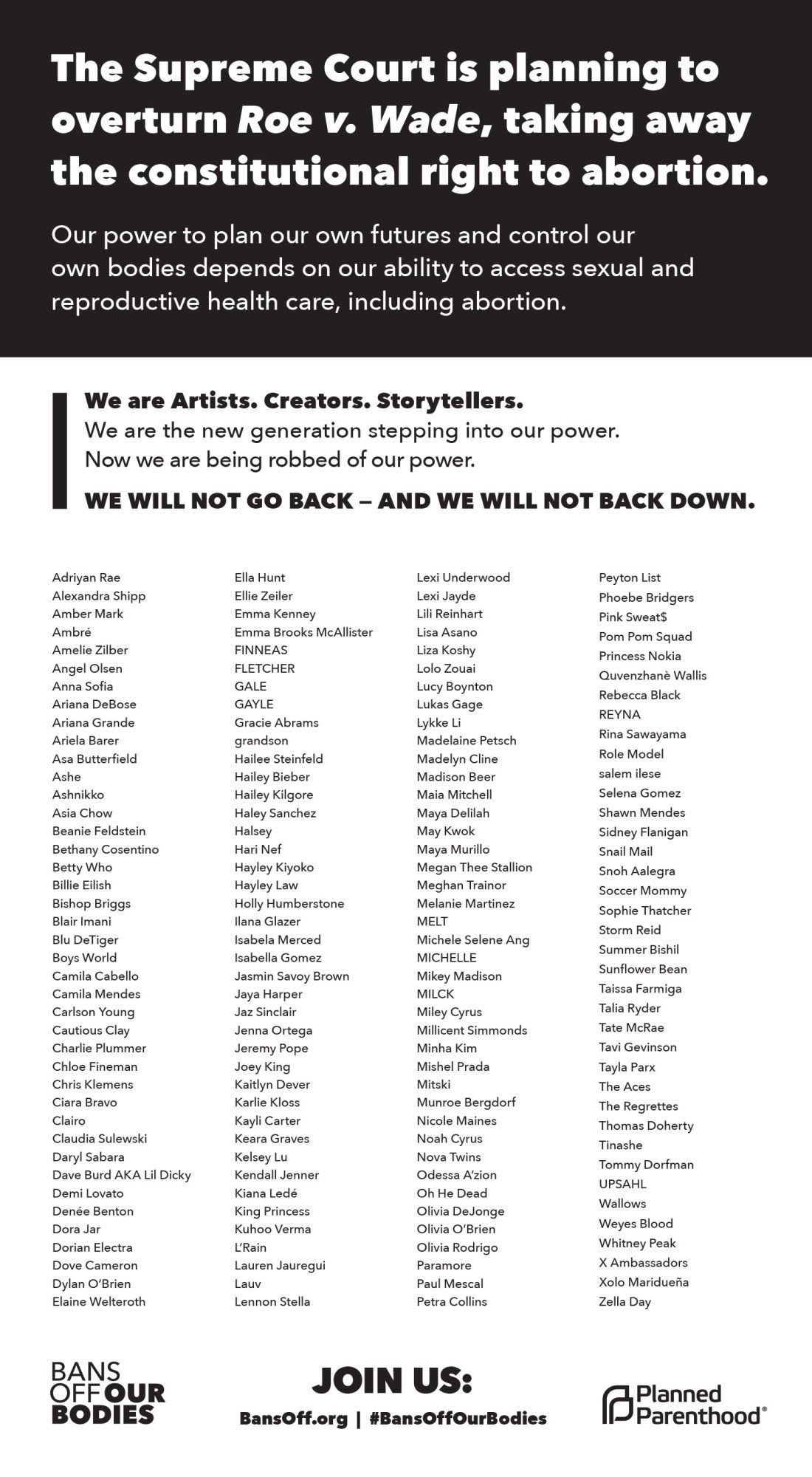 Dentro de quienes firmaron, se encuentran artistas como Ariana Grande, Angel Olsen, Billie Eilish, Demi Lovato, FINNEAS, Halsey, Miley Cyrus, Mitski, Olivia Rodrigo, Paramore, Phoebe Bridgers, Rina Sawayama, Selena Gomez, Shawn Mendes, Weyes Blood entre otros.