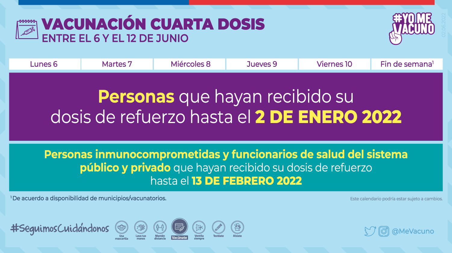 El Calendario de Vacunación desde el 6 de junio continuará teniendo la Cuarta Dosis como la principal en el proceso de inoculación. Tal como informó el Minsal, esta semana podrán recibirla los mayores de 18 años que hayan recibido su Dosis de Refuerzo hasta el 2 de enero.