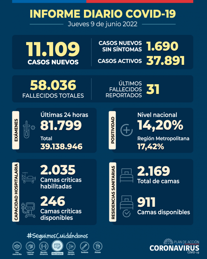 Asimismo, el Departamento de Estadísticas e Información de Salud (DEIS) confirmó la muerte de 31 pacientes. Sumando una cifra de fallecidos a 58.036 desde el inicio de la pandemia.