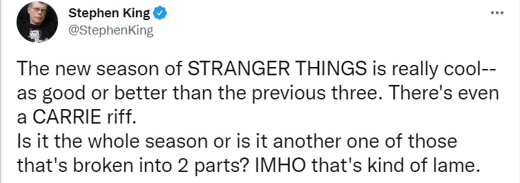 Ahora, King nuevamente volvió a mostrar su aprecio por la serie. A través de su Twitter, aplaudió la cuarta temporada, considerada la más aterradora hasta la fecha.