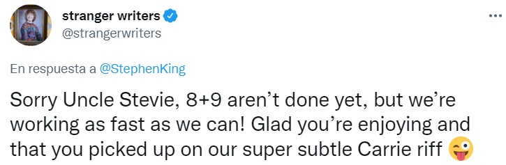 Tras su tweet, los creadores de Stranger Things le respondieron a Stephen King. "Perdón tio Stevie. El 8 y el 9 aún no están terminados, pero trabajamos tan rápido como podemos", escribieron. "Que bueno que lo disfrutes notaras la referencia a Carrie", finalizaron.