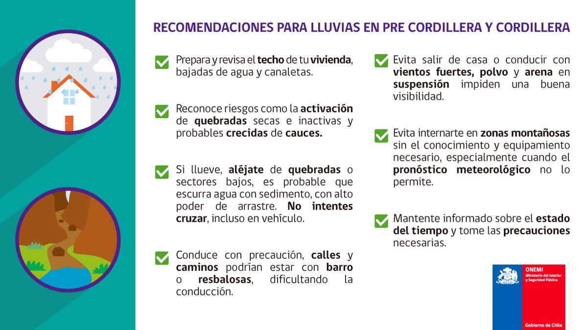 Ante esto, la Onemi emitió recomendaciones para tener precaución ante los efectos que pueda causar la lluvia en distintos puntos del país. "Evita cruces arriesgados en cauces, canales y esteros. Tampoco te acerques a sectores cordilleranos de manera temeraria si las condiciones meteorológicas son desfavorables", escribieron en su cuenta de Twitter.