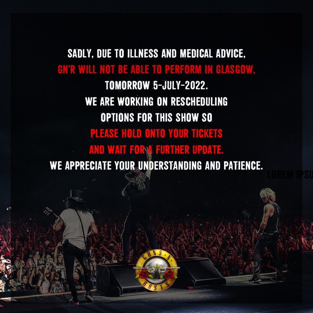 Tras lo sucedido, la banda dijo lo siguiente en un comunicado. “Lamentablemente, debido a una enfermedad y un consejo médico, GNR no podrá presentarse en Glasgow. Estamos trabajando en las opciones de reprogramación para este espectáculo, así que guarden sus boletos y esperen por actualizaciones. Apreciamos tu comprensión y paciencia”.