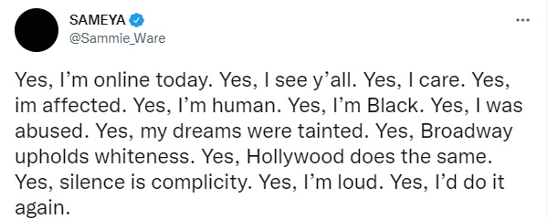 Ahora, Ware volvió a referirse al tema luego de que se anunciara la elección de Lea Michele para Funny Girl. "Sí, estoy conectada. Estoy afectada. Soy humana y soy negra. Fui abusada. Mis sueños fueron manchados", comenzó la actriz en su cuenta de Twitter.