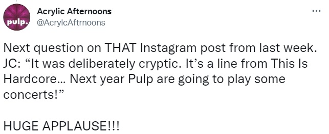 "Fue deliberadamente críptico. Es una línea de This Is Hardcore... El próximo año, Pulp va a tocar algunos conciertos", afirmó Cocker ante la emoción de los fanáticos. Así, la información rápidamente se comenzó a viralizar en redes.