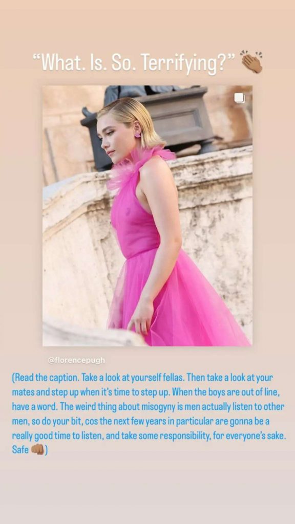 Luego, a través de una historia de Instagram, Regé Jean Page compartió la publicación de Florence Pugh y citando las propias palabras que había escrito. "¿Por qué les aterra tanto?.