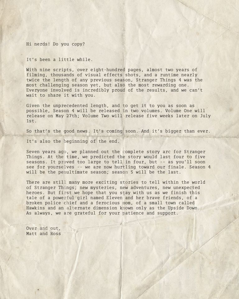 "Al comienzo, predijimos que la historia duraría entre cuatro a cinco temporadas. Probó ser mucho para solo cuatro. Pero, como pronto verán, nos estamos preparando para el final", escribieron los creadores en una carta a los fanáticos.