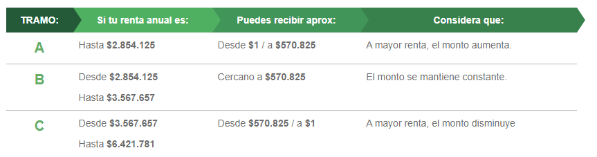 Debes considerar que si tienes una renta que llega hasta los $6.441.781 anuales, el monto que se te asignará será más bajo. Mientras que si recibes un valor inferior a los $2.854.125 el monto podrá bordear los $570.825.