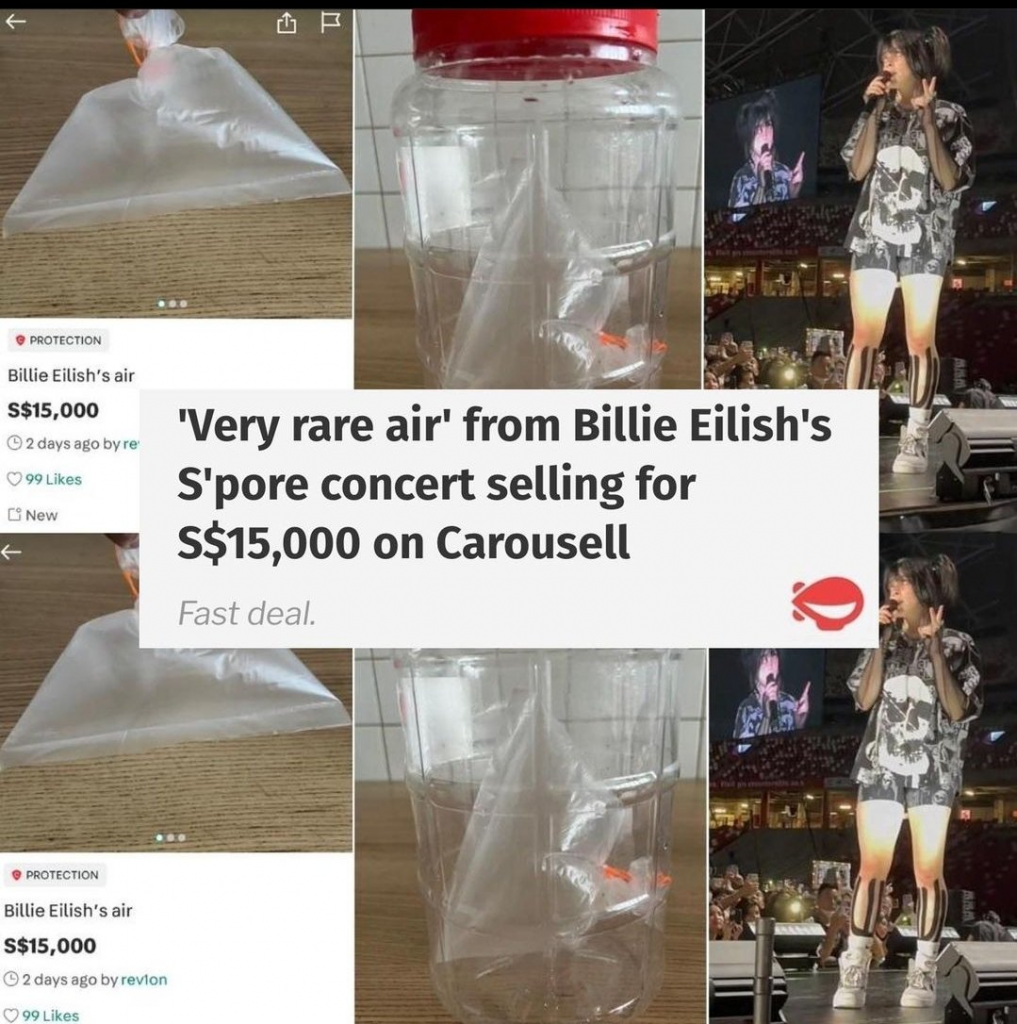 Según nuestra radio hermana, Los 40, uno de los asistentes al concierto de Billie Eilish en Singapur aseguró tener en venta una bolsa con el aire de la cantante. Esto por la módica suma de 15 mil dólares del país (algo así como 10 millones de pesos chilenos).
